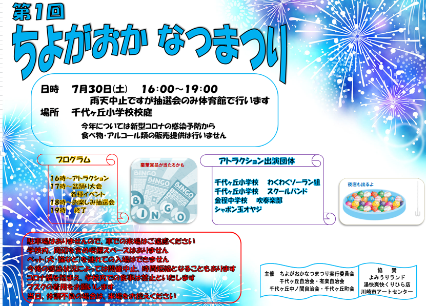 7月30日(土曜)午後 4時から 千代ヶ丘小学校にて 夏祭り を開催します。 4町会(千代ヶ丘自治会、有楽自治会、 千代ヶ丘中ノ間自治会、千代ヶ丘町会)主催で行いますので、麻生区千代ヶ丘地域の皆様、ご家族や子供たちと一緒にぜひご参加ください。